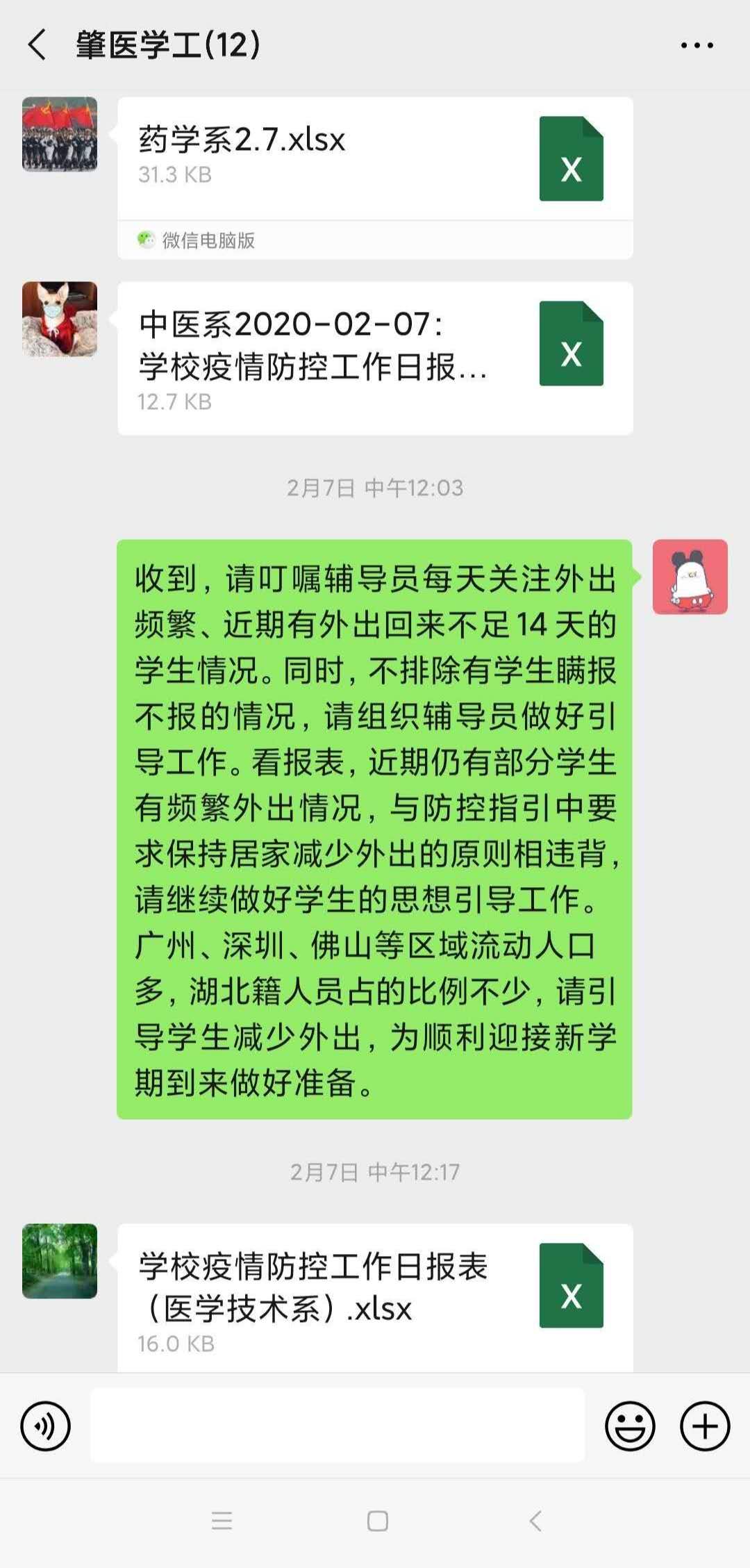 近期,学工队伍高度重视防疫工作,学生工作处处长李小兰通过网络办公平台,不断强化工作纪律和工作要求,她指出:我市即将迎来复工复产,人员流动性、集聚性大大增强,疫情防控工作将面临新的挑战,各系务必进一步提高政治站位,高度重视做好企业复工复产背景下的疫情防控工作的重要性、复杂性、严峻性,当前我校打赢疫情防控阻击战仍处于最紧要的关头,要高度关注学生心理和情绪管理工作,及时了解学生身体健康状态。