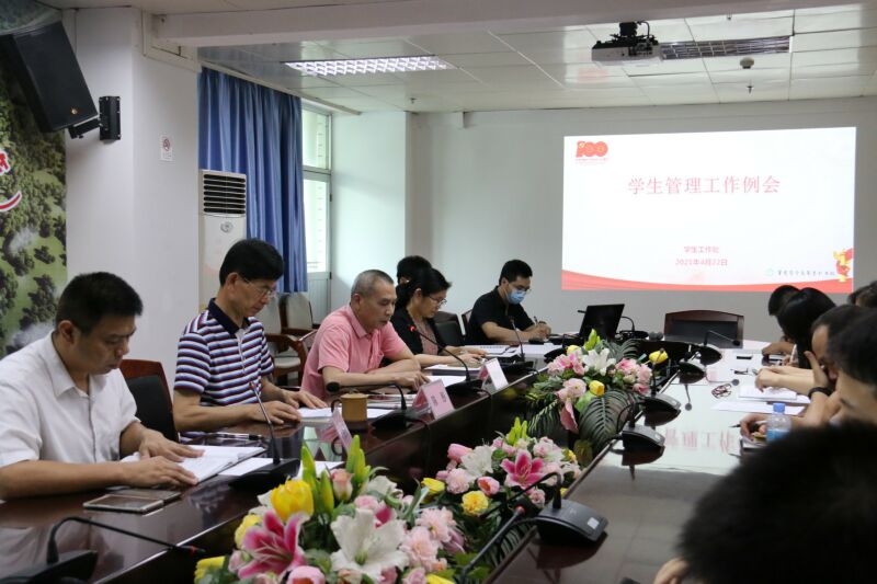 2021年4月22日下午,我校在端州校区三楼会议室召开学生管理工作例会。小结学生管理方面的阶段性工作;部署春夏之交敏感节点的意识形态和政治安全工作;部署“五一劳动节”假期安全、疫情防控工作以及切实做好毕业生服务、持续推进大学生应征入伍、学生心理健康、2022届学生毕业实习工作准备、学校学生日常管理等方面的工作。