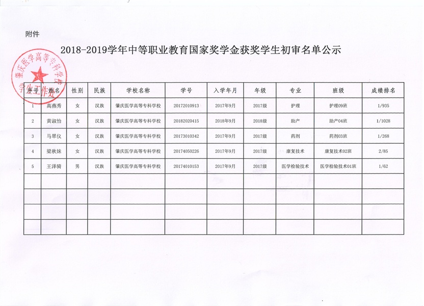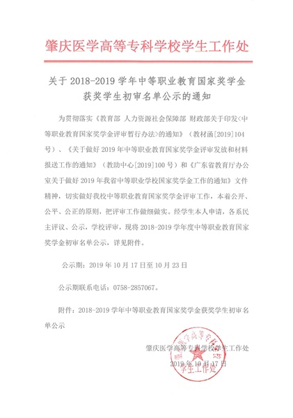 关于2018-2019学年中职职业教育国家奖学金获奖学生初审名单公示的通知